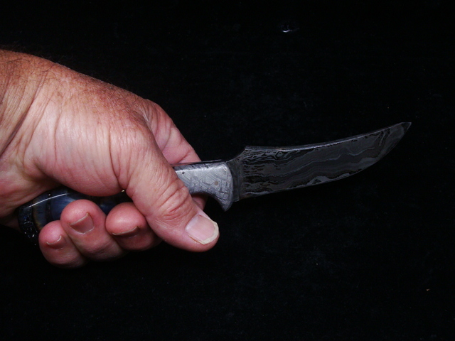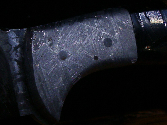 Beaux Recatto: Meteorite Damascus Sharp Finger Skinner Blade: Meteorite Damascus - Sikhote-Alin and heat treated 1084 Steel Forged by Rich Greenwood Bolsters: Muonionalusta Meteorite Handle: Crosscutr Mammoth Ivory Overall Length: 8.5" Blade Measures: 4.38" (Full Tang) Weight: 202 gms Handmade Leather Sheath