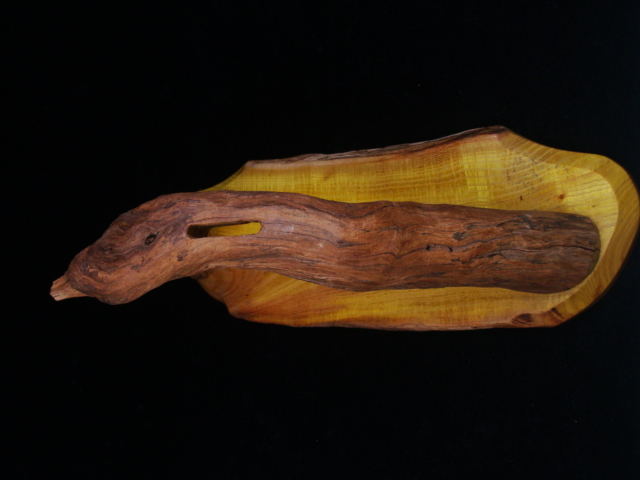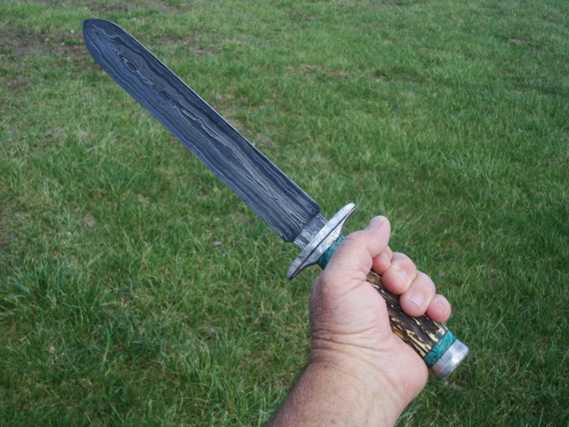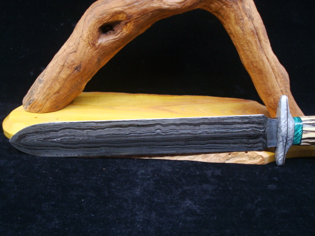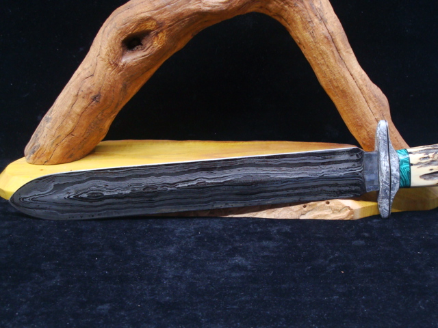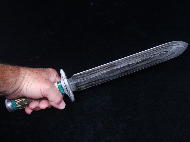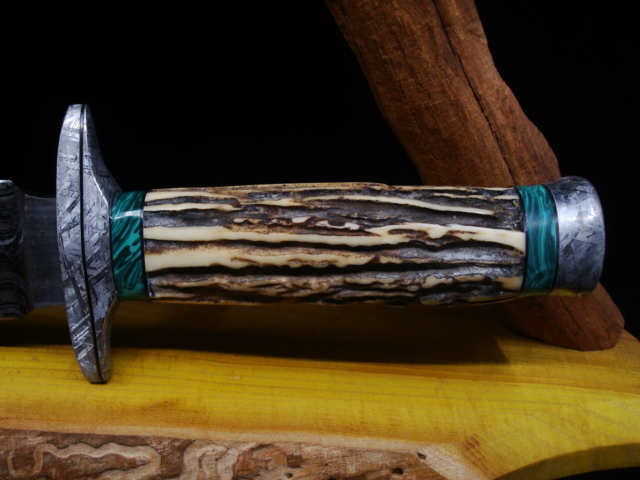 Beaux Recatto: Meteorite Damascus Sword Blade: Meteorite Damascus - Sikhote-Alin and heat treated 1084 Steel Forged by Rich Greenwood Guard: Gibeon Meteorite Handle: Sambar Stag Pommel: Gibeon Meteorite Spacers: Stabilized Malachite Overall Length: 16.5" Blade Measures: 10.75" Weight: 488 gms Handmade Custom Display Stand: Osage Orange Wood