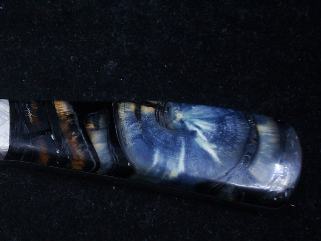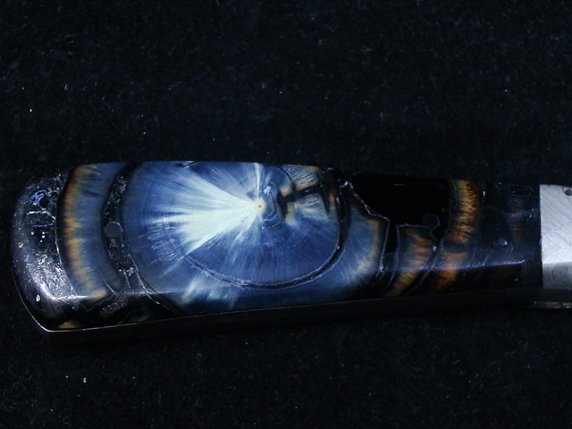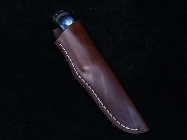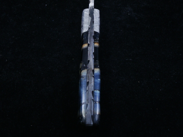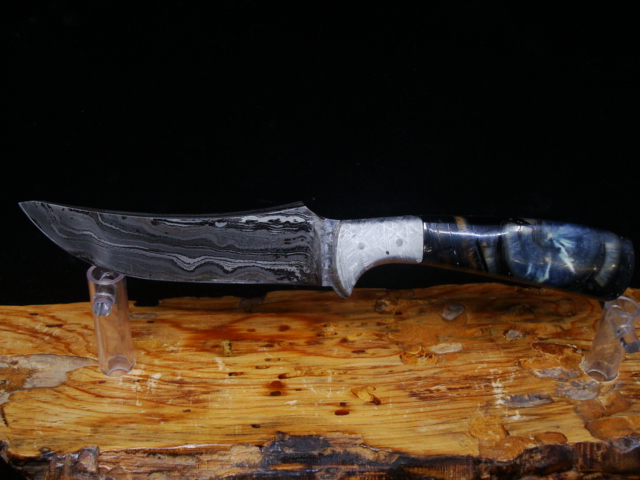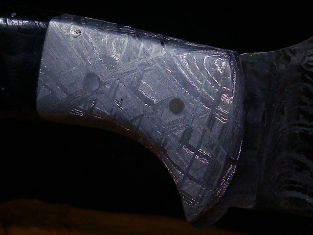 Beaux Recatto: Meteorite Damascus Sharp Finger Skinner Blade: Meteorite Damascus - Sikhote-Alin and heat treated 1084 Steel Forged by Rich Greenwood Bolsters: Muonionalusta Meteorite Handle: Crosscutr Mammoth Ivory Overall Length: 8.5" Blade Measures: 4.38" (Full Tang) Weight: 202 gms Handmade Leather Sheath