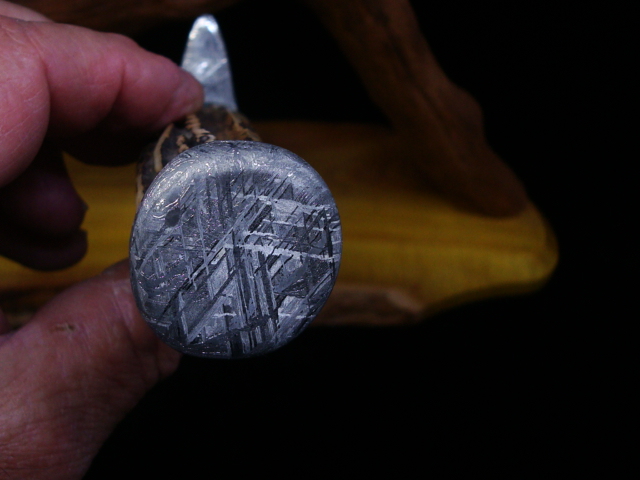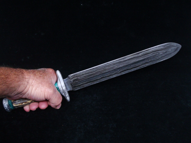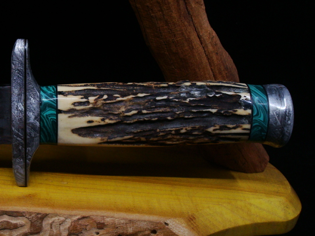 Beaux Recatto: Meteorite Damascus Sword Blade: Meteorite Damascus - Sikhote-Alin and heat treated 1084 Steel Forged by Rich Greenwood Guard: Gibeon Meteorite Handle: Sambar Stag Pommel: Gibeon Meteorite Spacers: Stabilized Malachite Overall Length: 16.5" Blade Measures: 10.75" Weight: 488 gms Handmade Custom Display Stand: Osage Orange Wood